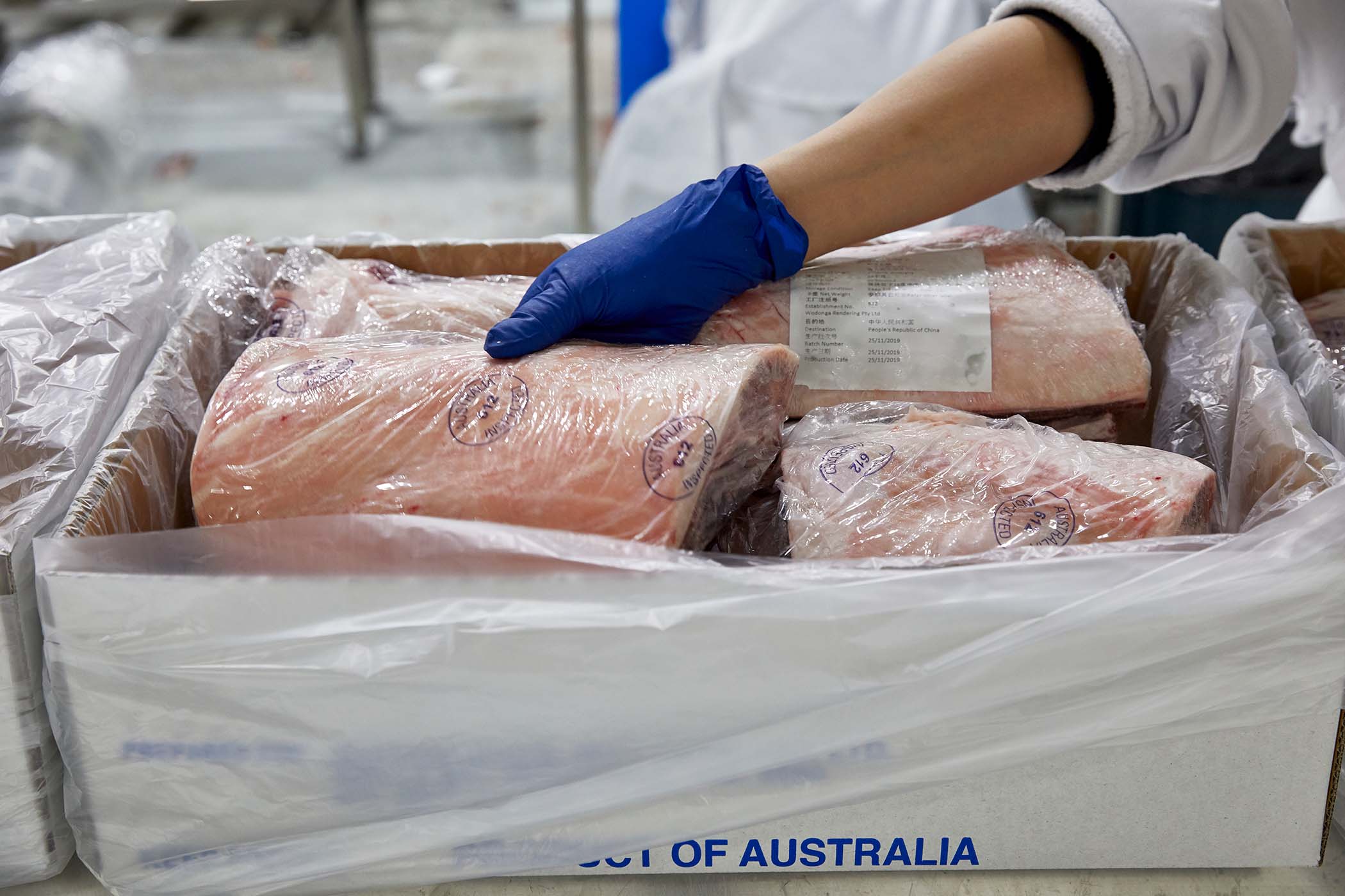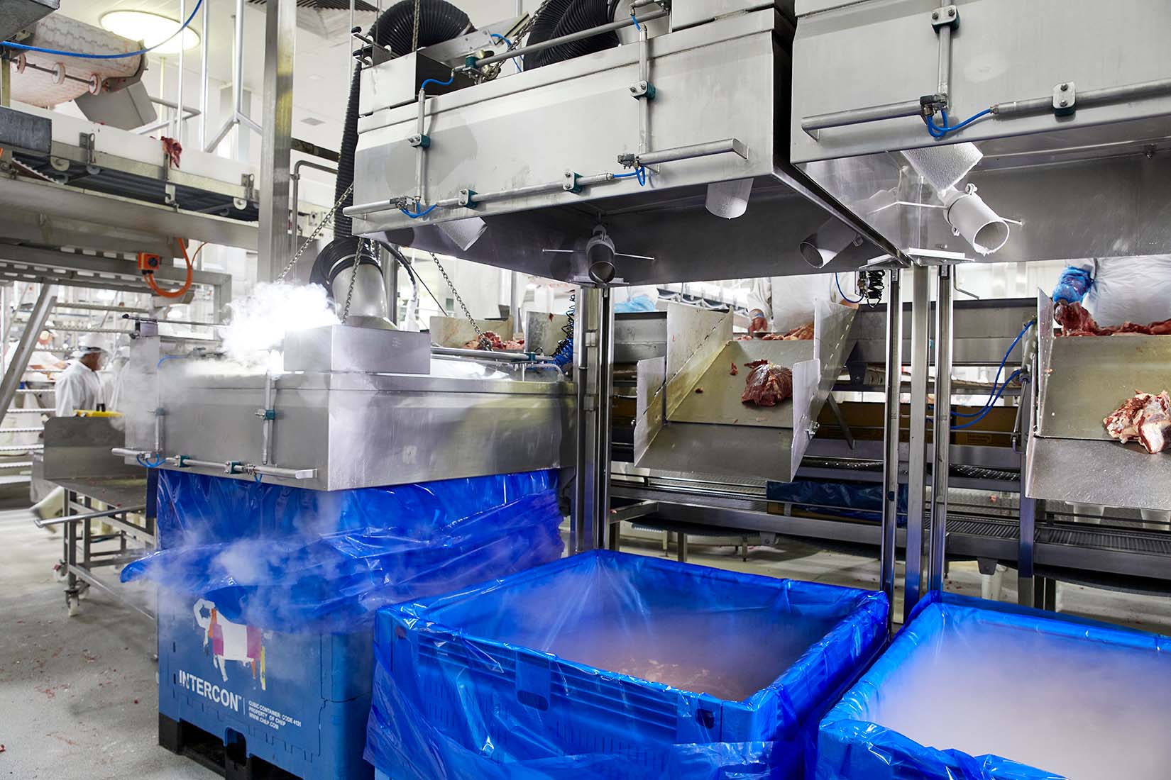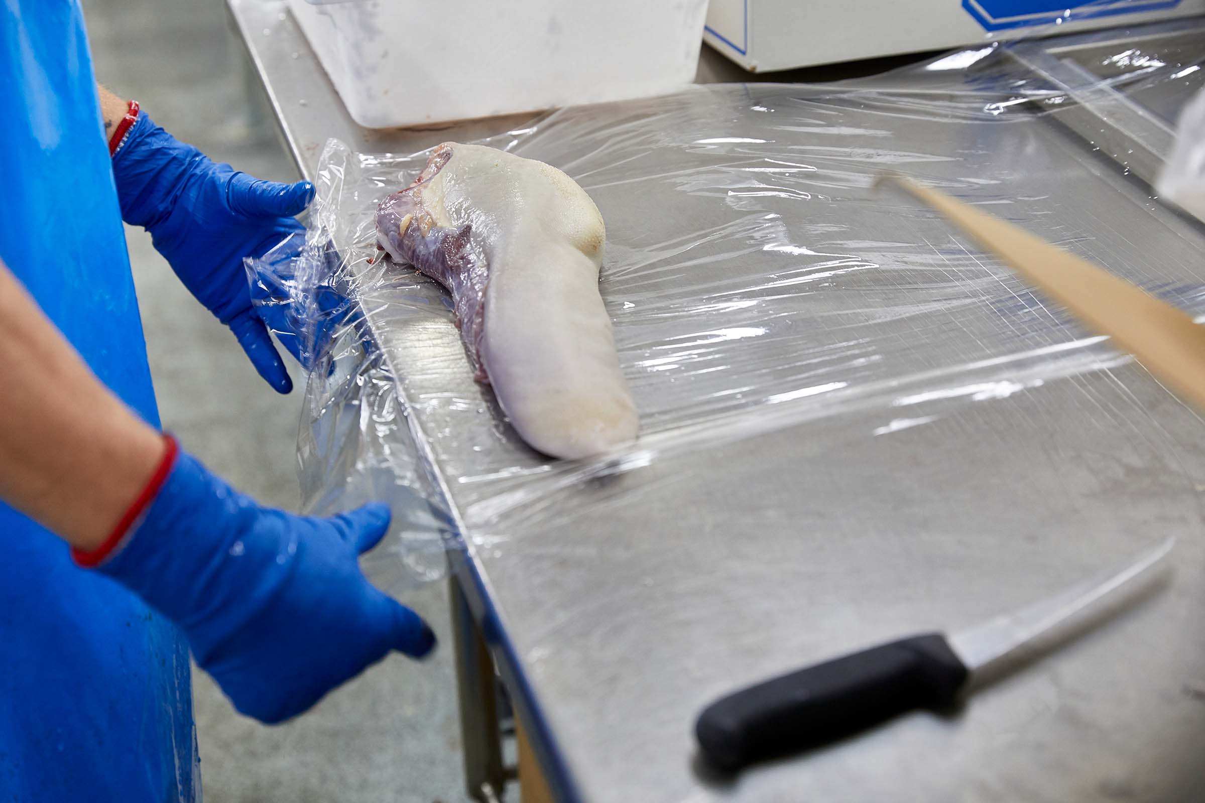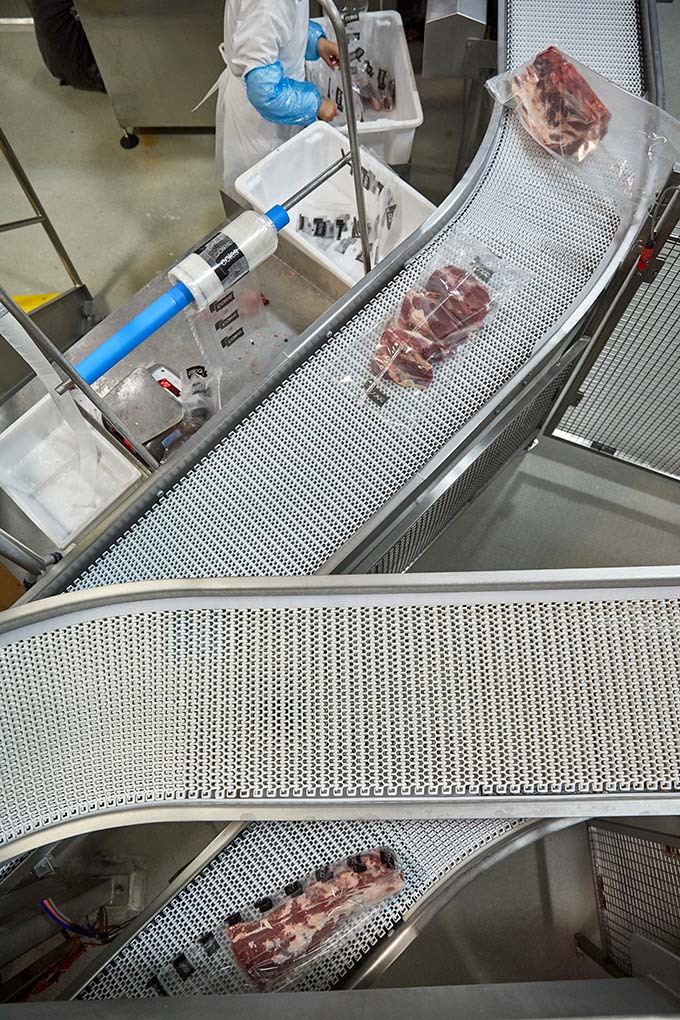 Sau đó, sản phẩm thường được chia thành các phần lớn và đóng gói hút chân không. (Lưu ý: Một số sản phẩm được xử lý và đóng gói bằng các vật liệu khác nhau, ví dụ như trong khay định hình nhiệt hoặc sử dụng bao bì màng cho các phần bít tết hoặc sản phẩm sẵn sàng bán lẻ).