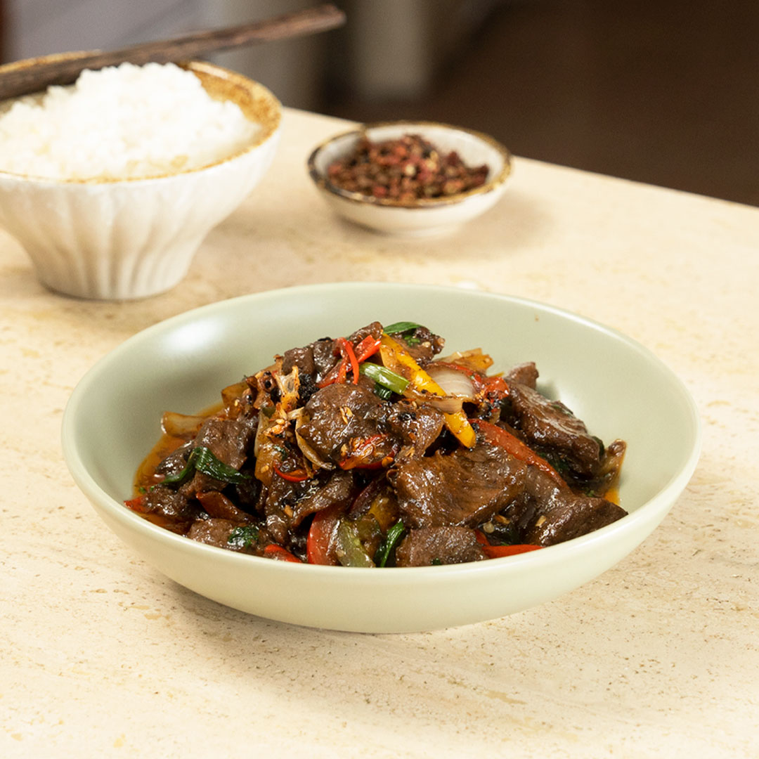 Rửa sạch chảo wok, đặt lên lửa vừa, và thêm ¼ cốc dầu cải. Đun nóng dầu trong thời gian ngắn, sau đó thêm ớt xay và tiêu Tứ Xuyên, nấu cho đến khi dậy mùi thơm nhưng không cháy. Thêm thịt bò vào chảo và xào nhanh.